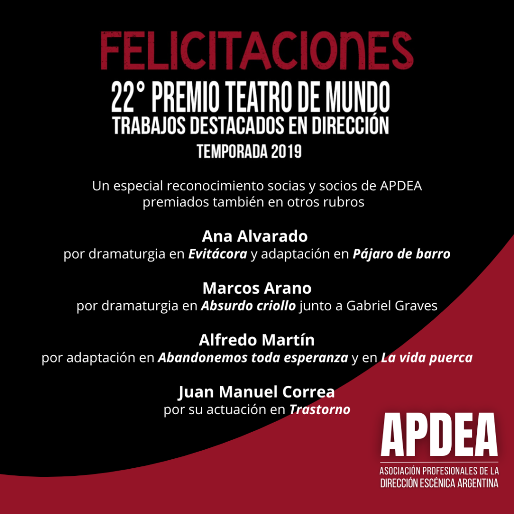 También queremos hacer un especial reconocimiento a socias y socios de APDEA Ana Alvarado, Marcos Alano, Alfredo Martín y Juan Manuel Correa, premiados tambien en otros rubros de esta edición.
